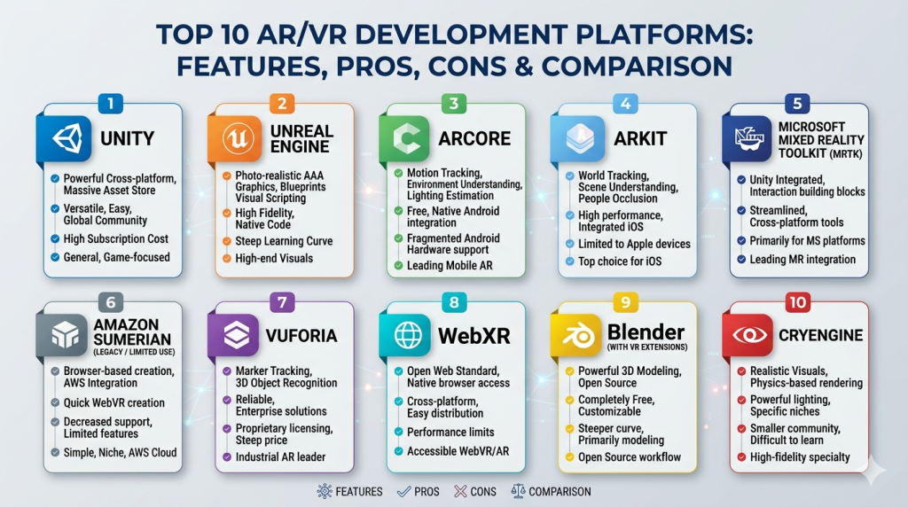 AR/VR development platforms are evolving rapidly, driven by advances in AI, spatial computing, and enterprise adoption. While Unity and Unreal Engine dominate in flexibility and performance, specialized tools like Vuforia and MRTK offer strong enterprise capabilities.
