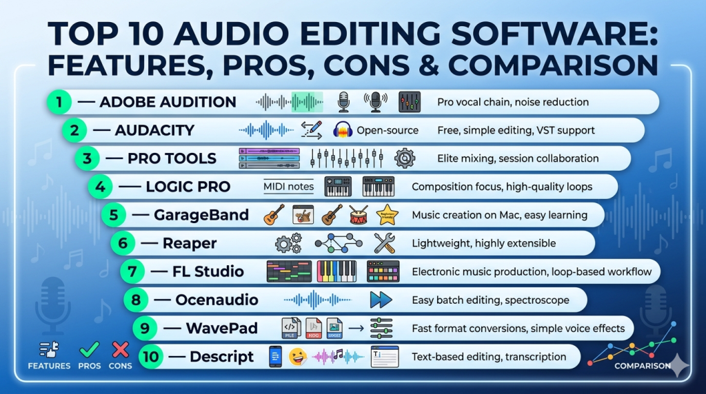 Audio editing software in 2026 is more powerful and accessible than ever, offering solutions for everyone—from beginners to professional studios. Tools like Pro Tools and Adobe Audition lead in professional environments, while Audacity and Descript provide accessible entry points.