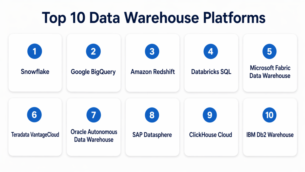 Data warehouse platforms remain a foundational layer for modern analytics, even as the market expands toward lakehouse, AI, and unified data platform models. The strongest choices differ in where they win. Snowflake stands out for balance and ecosystem breadth, BigQuery for serverless simplicity, Amazon Redshift for AWS alignment, Databricks SQL for lakehouse and AI convergence, and Microsoft Fabric Data Warehouse for Microsoft-first analytics consolidation. Enterprise-oriented options like Teradata, Oracle, SAP, and IBM still matter where governance, platform fit, and legacy alignment are strategic. ClickHouse Cloud adds a strong performance-driven alternative for analytics-heavy teams.