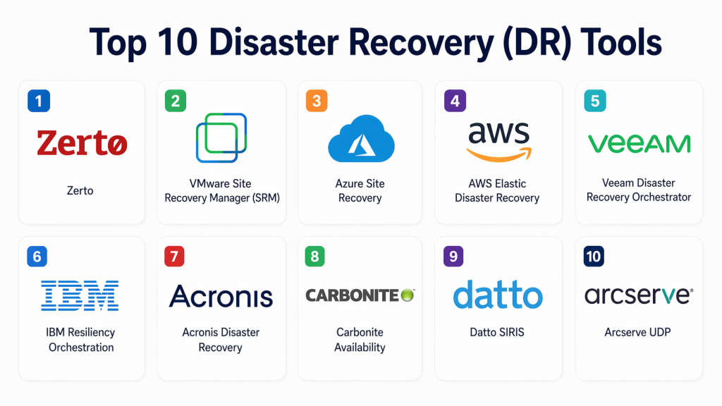 Disaster Recovery (DR) Tools are specialized platforms that help organizations restore IT systems, applications, and data after disruptions such as cyberattacks, hardware failures, or natural disasters. Unlike basic backups, DR tools focus on complete system recovery, minimizing downtime, and ensuring business continuity.