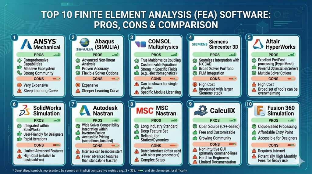 Finite Element Analysis software is essential for modern engineering, enabling accurate simulations that reduce costs and improve product quality. The best tool depends on your specific needs—whether it’s ease of use, advanced capabilities, or cost efficiency.