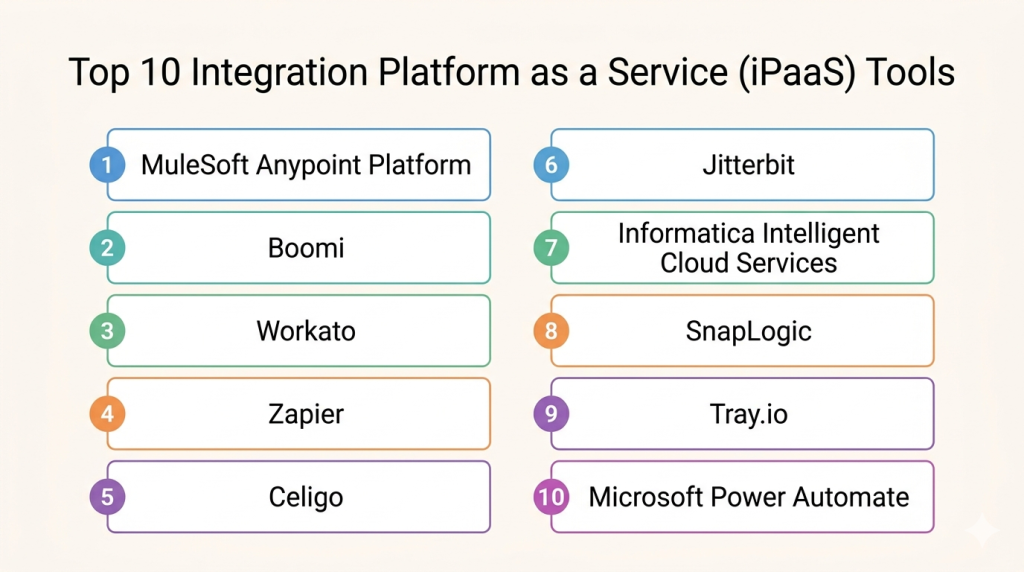 The best Integration Platform as a Service (iPaaS) tool depends on your company size, existing software stack, security needs, and automation maturity. SMBs may win with simplicity-focused platforms like Zapier or Power Automate, while enterprises often need the governance and scale of MuleSoft, Boomi, or Informatica. Mid-market companies usually benefit from flexible platforms like Workato, Celigo, or Jitterbit. Instead of chasing the biggest brand, shortlist 2–3 tools that match your workflows, test critical integrations, compare total cost, and run a pilot before full rollout.