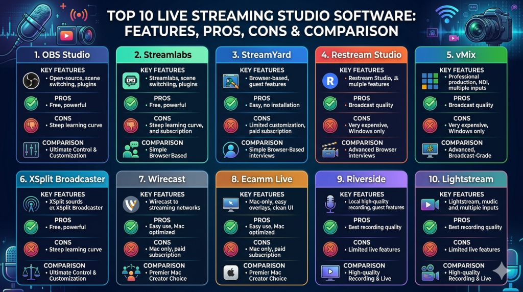 Live streaming studio software helps creators, businesses, and organizations produce, manage, and broadcast live video content with professional-level control. Unlike basic streaming tools, these platforms provide features such as multi-camera switching, overlays, real-time production controls, and audience engagement tools.