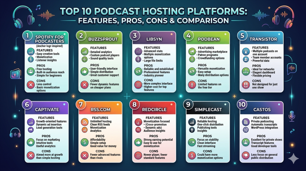 Top 10 Podcast Hosting Platforms: Features, Pros, Cons & Comparison