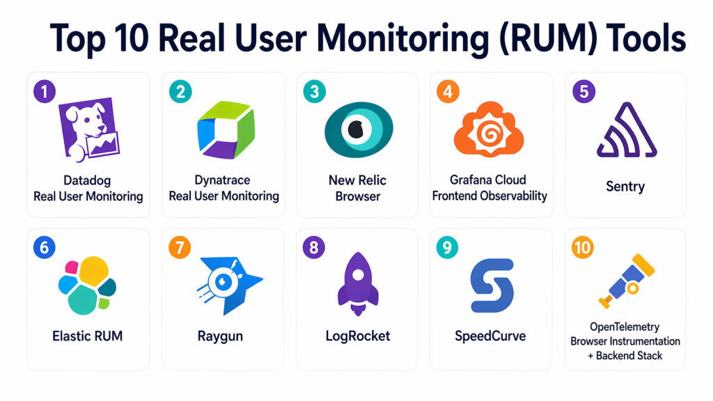 RUM matters more now because digital experiences are judged by real users in real time. A site may pass internal performance checks and still feel slow for users on weaker devices, mobile networks, or specific geographies. Common use cases include measuring Core Web Vitals, identifying frontend errors, validating release impact, tracking region-specific issues, and connecting user frustration to backend latency. Buyers should evaluate Core Web Vitals coverage, error monitoring, session visibility, frontend-to-backend correlation, privacy controls, alerting, dashboard quality, deployment simplicity, mobile support, and cost model.